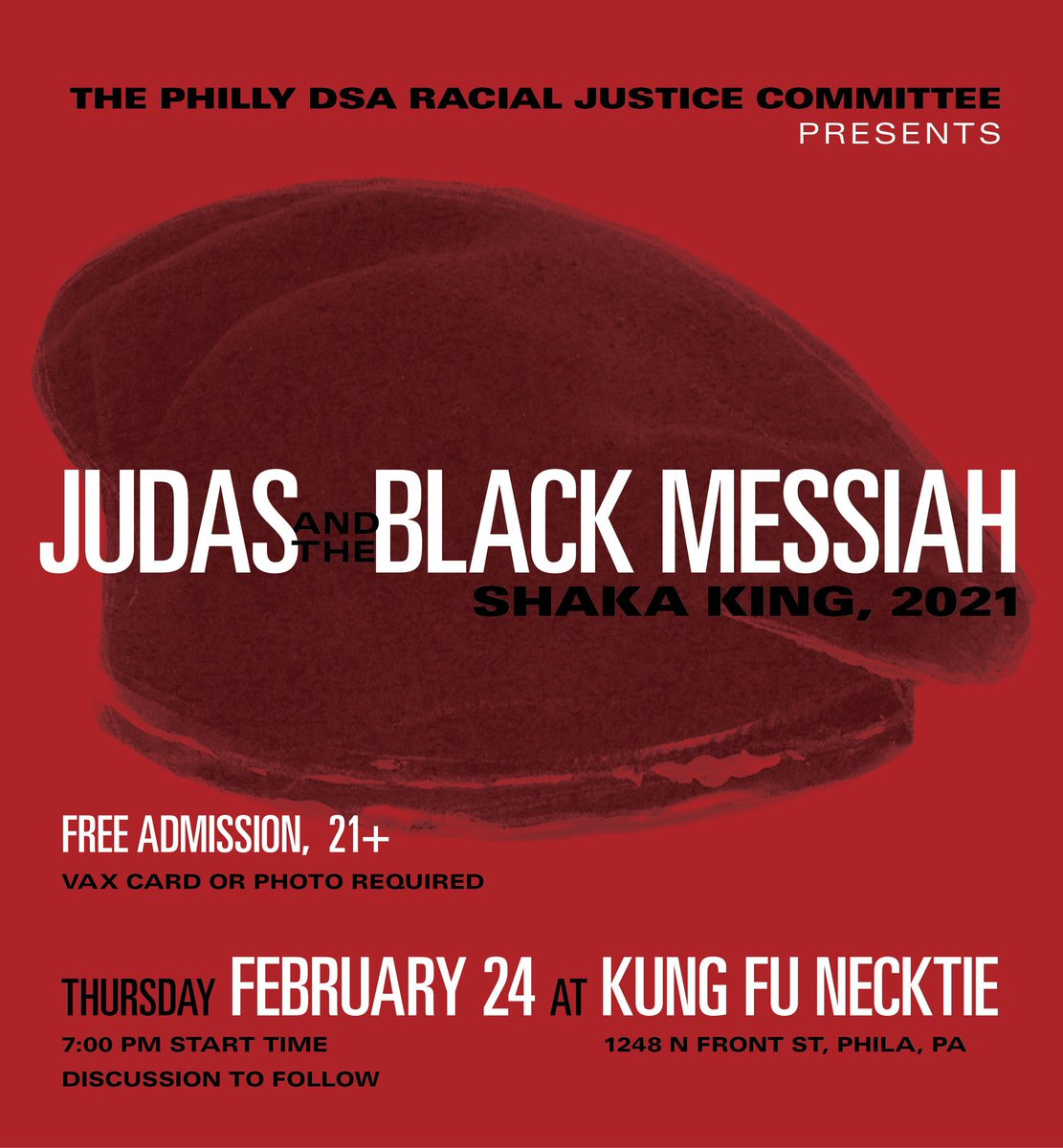 Come join us now at @kungfunecktie for our FREE screening of the multi-Academy Award nominated film Judas and the Black Messiah followed by a group discussion. Free admission! 21+, and open to everyone! Please bring proof of vaccination! https://t.co/y2AJPbuq6v |