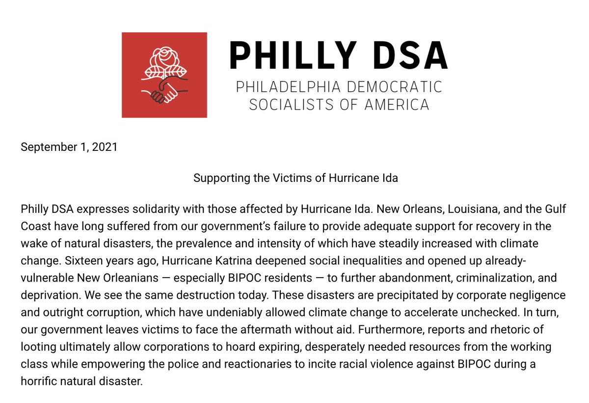 Philly DSA expresses solidarity with those affected by #HurricaneIda. Read our full statement: https://t.co/g7c6xGJKwW |