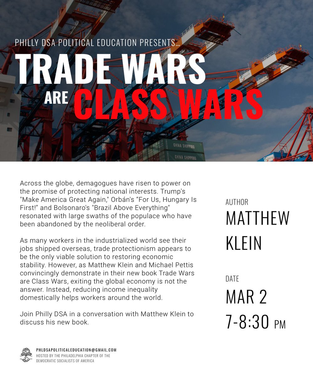 Tonight at 7pm we welcome author Matt Klein to discuss the right wing trade protectionism that has risen to prominence in recent years, and how we can fight for an approach based on working class solidarity instead. RSVP for the zoom link! https://t.co/96Vi4nHGiq https://t.co/ZjIoVGnZVA |