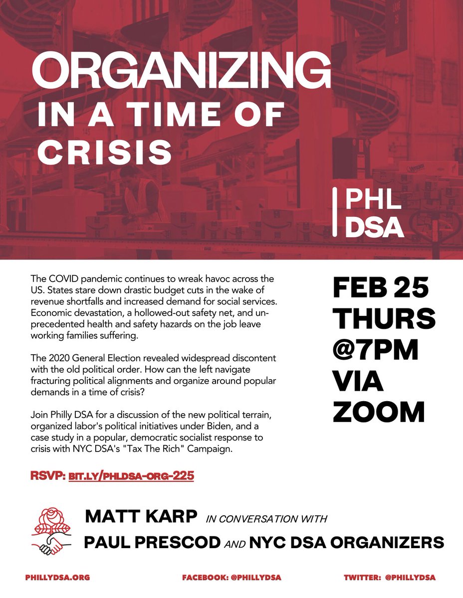 Join us, @karpmj, and organizers with NYC-DSA's Tax the Rich campaign this Thursday at 7pm for our panel "Organizing in a Time of Crisis". Check out on the current political situation Matt's article below! RSVP here: https://t.co/pHYFAaJia7 https://t.co/kQIG2nayDY | 10 | 10452 | |