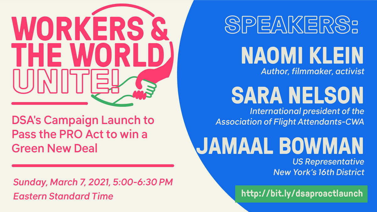 Sunday @ 5pm, join Naomi Klein, Sara Nelson, & Jamaal Bowman for the launch of DSA National's campaign to #PassTheProAct. Voting on the act is expected next week! https://t.co/0lXZSjZCdE https://t.co/Tkoq20fcn7 |
