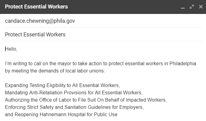 Call Mayor Kenney’s office of labor at (215) 686-2163 and tell him to #ProtectEssentialWorkers in Philadelphia, and follow up with this email message! You can read the unions and allied organizations' demands for expanded essential worker protections here: https://t.co/RDE4rD8DsO https://t.co/ADFlzcRvS0 |