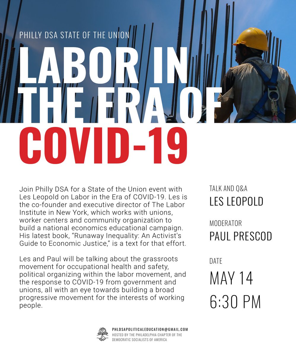 Join us on May 14th @ 6:30 for a discussion on Labor in the Era of COVID-19! https://t.co/499av4wcYf https://t.co/5syjj4b2mY |